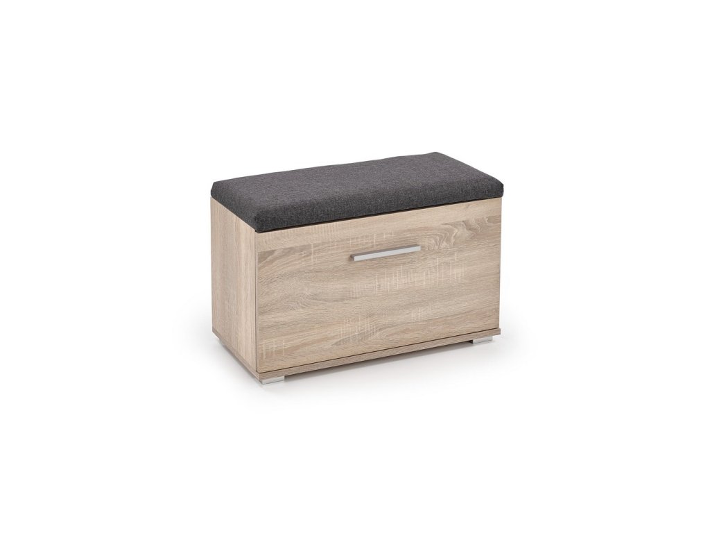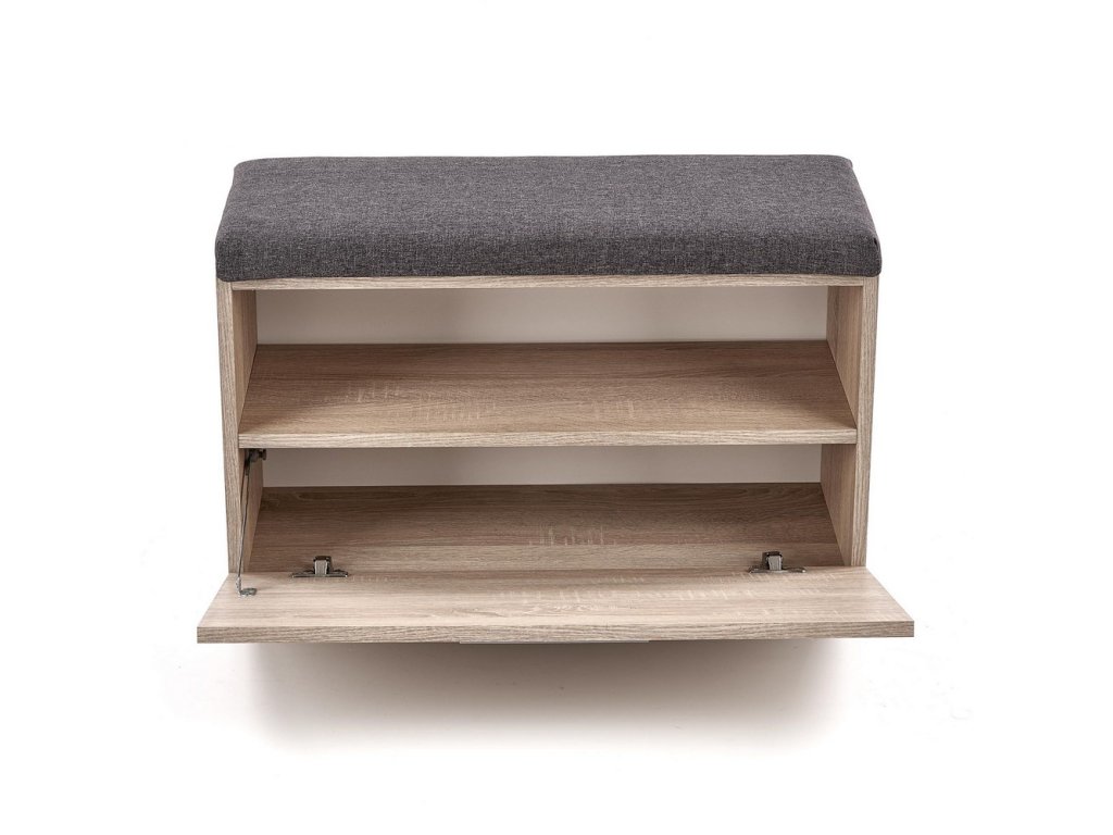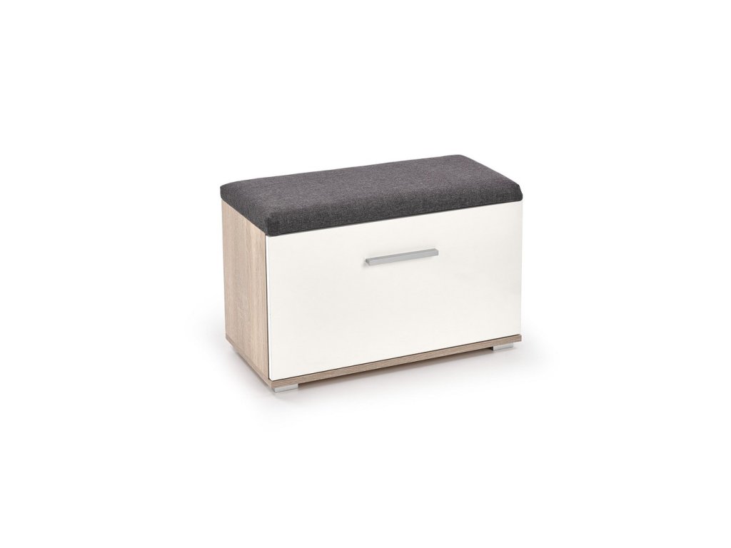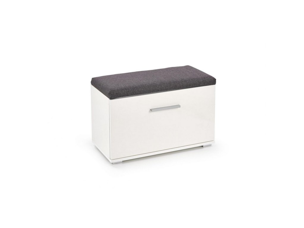 Rozměry 70 × 32 × 45 cm (délka × hloubka × výška), materiál laminované desky s vysokým leskem, ABS hrana, police, látkový sedák, nosnost horní části botníku je 90 kg, polička udrží maximálně 5 kg