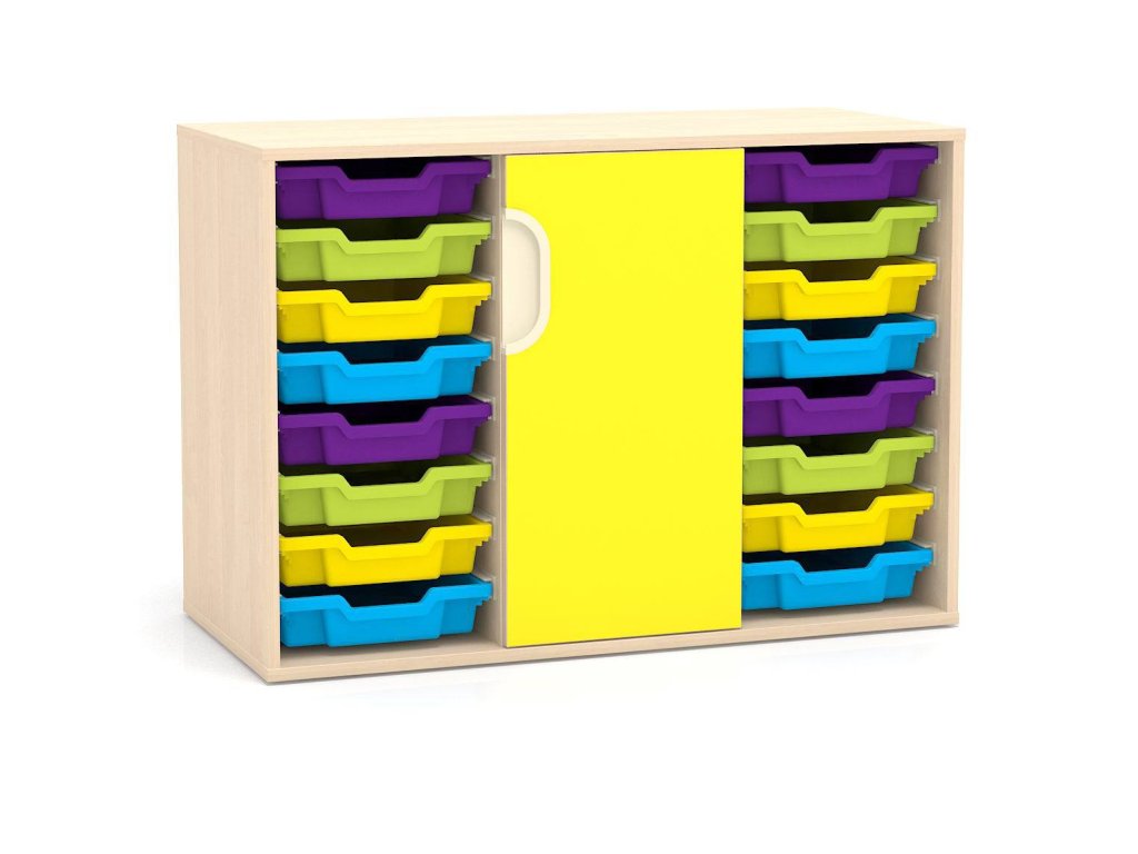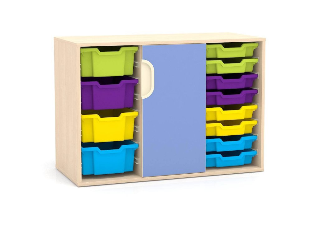 Nízká skříň pro MŠ kombinovaná s 16 páry vodících lišt a dveřmi se zámkem, 73,5x104,9x48 cm, z laminované dřevotřísky o síle 18 mm, 2 police, možnost barevných kombinací