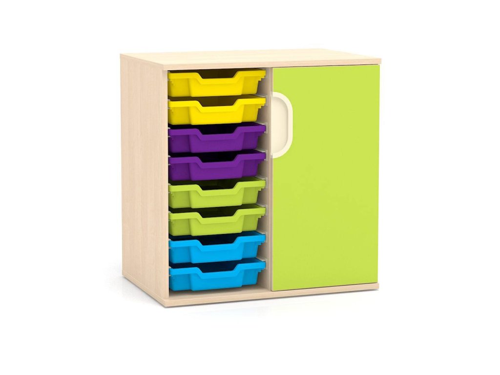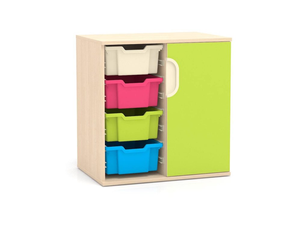 Nízká skříň pro MŠ kombinovaná se zámkem, 73,5x76x48 cm, z laminované dřevotřísky o síle 18 mm, dveře na pravé straně, 8 párů vodících lišt, 2 police, možnost barevných kombinací