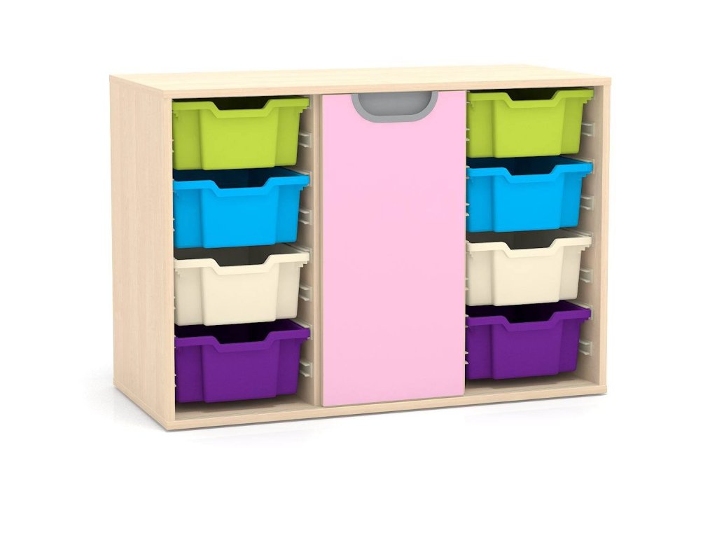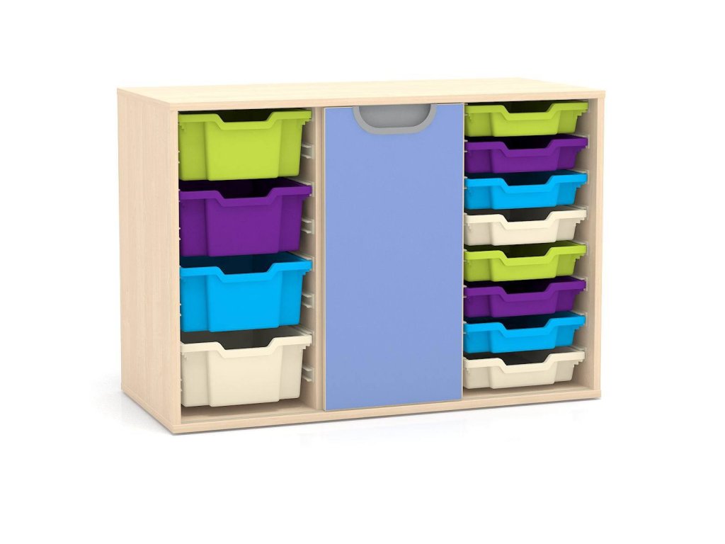 Nízká skříň pro MŠ kombinovaná s poduvnými dveřmi, 16 páry vodících lišt a zámkem, 73,5x104,9x48 cm, z laminované dřevotřísky o síle 18 mm, 2 police, možnost barevných kombinací