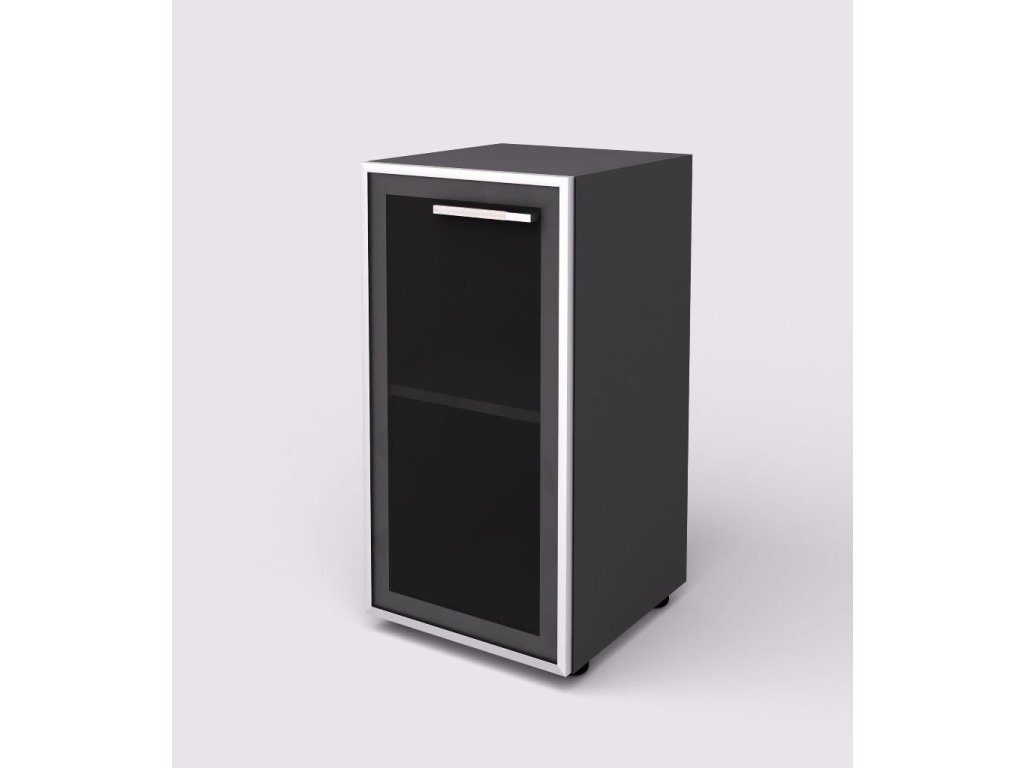 Kancelářské skříně mají šedé korpusy tl. 18 mm. Skleněné dveře v hliníkovém rámu. Police o síle 18 mm jsou v šedé barvě, výšku je možné regulovat. Skříně mají plastové rektifikační nožičky. Skleněné dveře jsou v hliníkovém rámu s barvou skla - grafit. Ke skříním je nutno doobjednat obkladové desky o síle 38 mm v barvě nábytku. Úchytky jsou kovové, levé provedení.