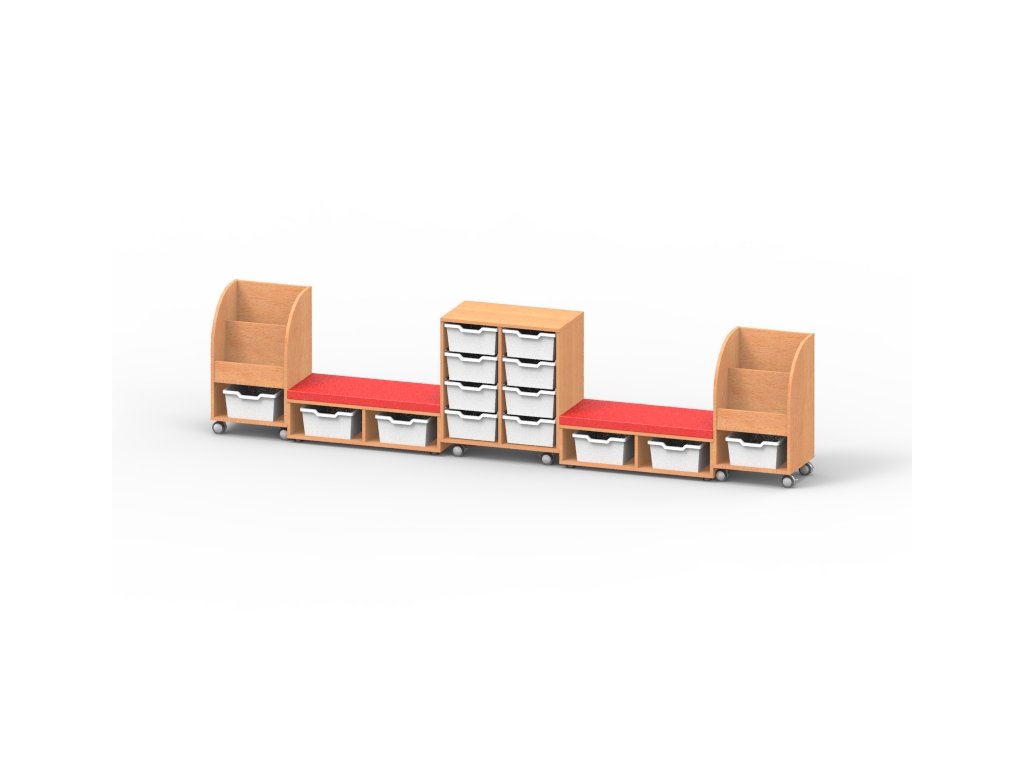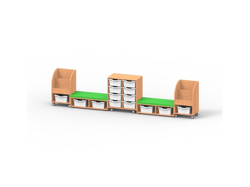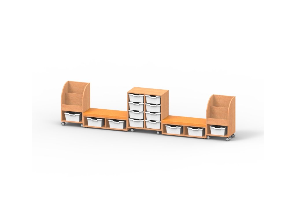 Nábytková sestava naší řady Basic, 340x79x40 cm, z laminované dřevotřísky o síle 18 mm, ABS hrana, s kolečky a soklem.