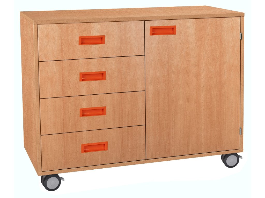 Skříňka kombinovaná se zásuvkami a dveřmi, s kolečky