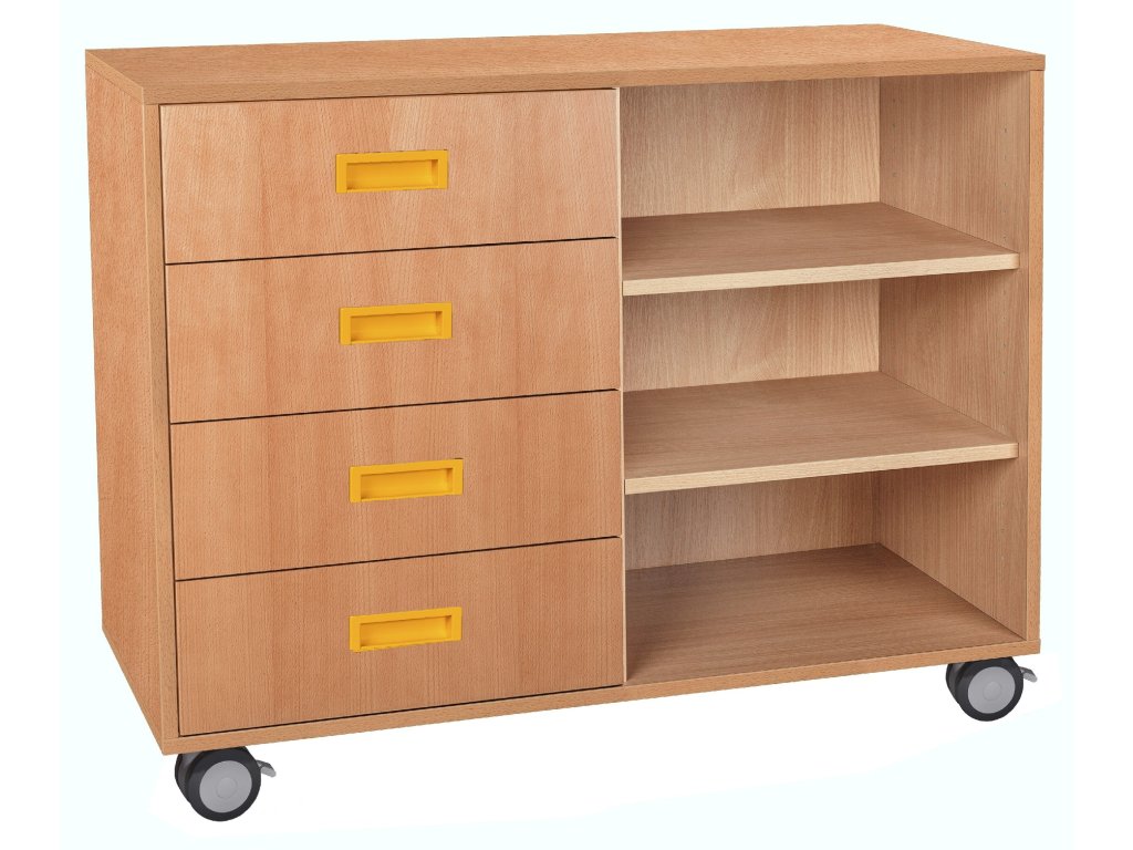 Skříňka kombinovaná se zásuvkami a policemi, s kolečky