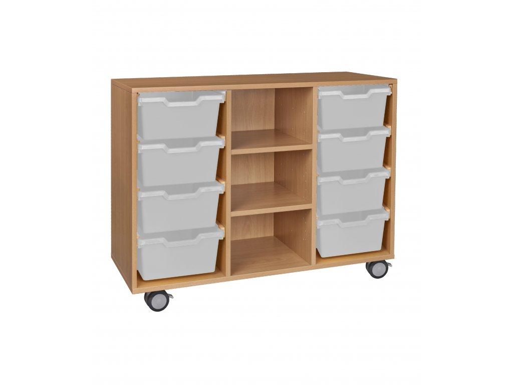 Střední skříň kombinovaná policová se zásuvkami, 104x79x40 cm, z laminované dřevotřísky o síle 18 mm, ABS hrana, s kolečky.