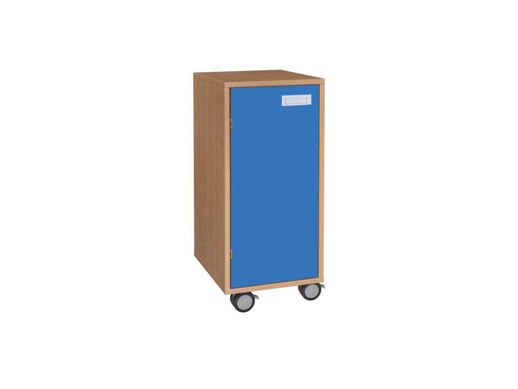 Nízká skříň policová jednodvéřová, 36x79x40 cm, z laminované dřevotřísky o síle 18 mm, ABS hrana, s kolečky.