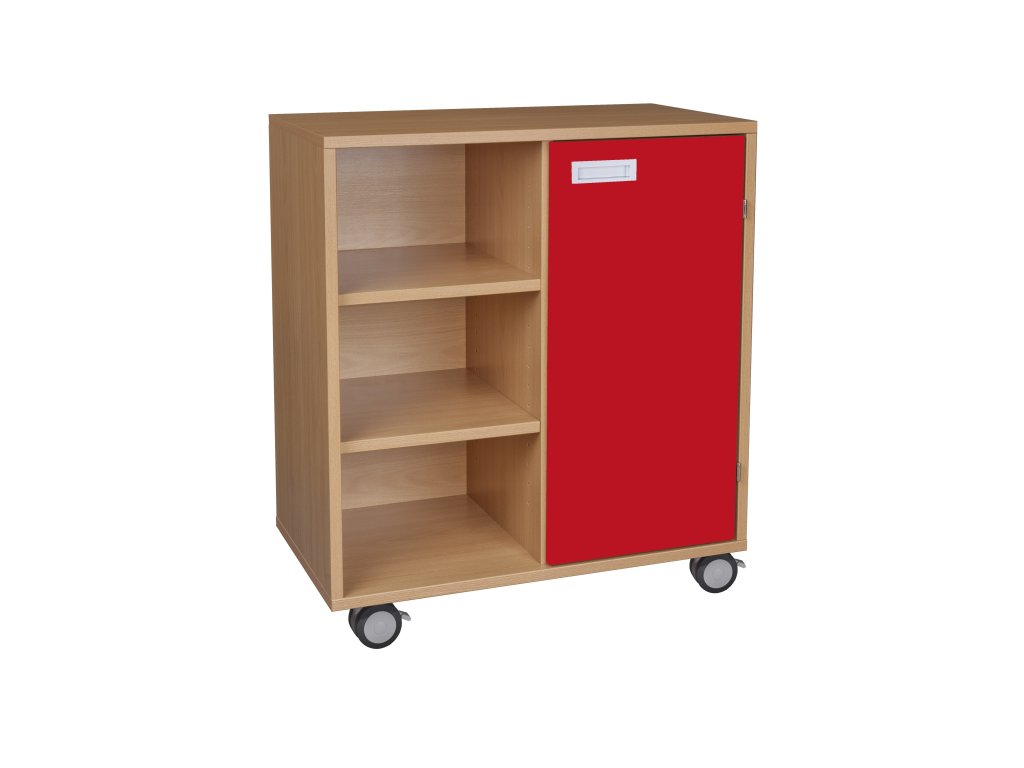 Nízká skříň kombinovaná jednodvéřová policová, 70x79x40 cm, z laminované dřevotřísky o síle 18 mm, ABS hrana, s kolečky.