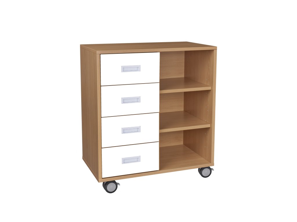 Nízká skříň kombinovaná policová se zásuvkami, 70x79x40 cm, z laminované dřevotřísky o síle 18 mm, ABS hrana, s kolečky.