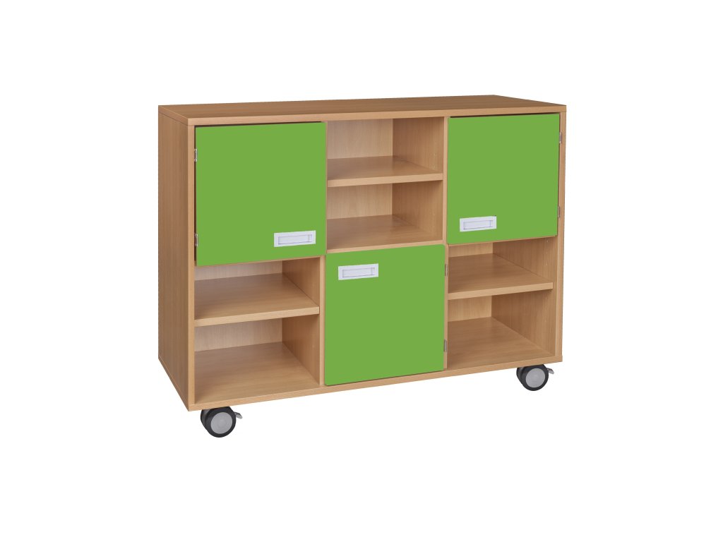 Střední skříň kombinovaná třídvéřová policová, 104x79x40 cm, z laminované dřevotřísky o síle 18 mm, ABS hrana, s kolečky.