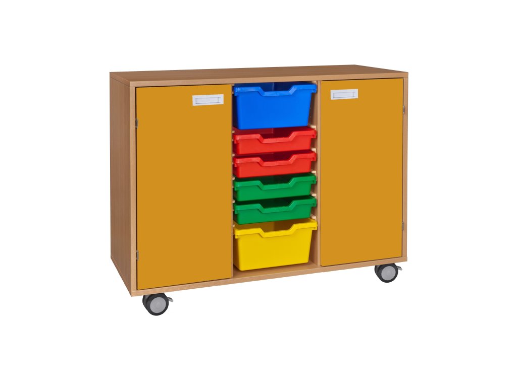 Střední skříň kombinovaná dvoudvéřová se zásuvkami, 104x79x40 cm, z laminované dřevotřísky o síle 18 mm, ABS hrana, s kolečky.